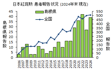 島根県では、年間数人~10数人の患者発生があり、特に弥山山地沿いで多いほか、県西部でも発生が認められています。