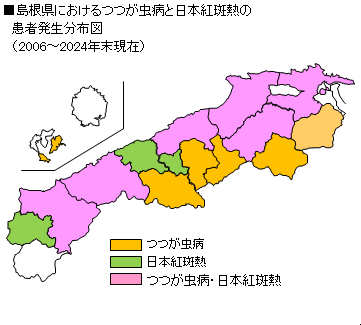 ■ つつが虫病島根県では、年間数人~10数人の患者発生があり、特に弥山山地沿いで多いほか、県西部でも発生が認められています。