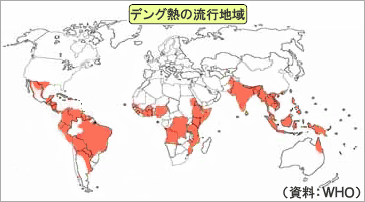 デング熱(Dengue fever)は、マラリアと同様に東南アジアなどの熱帯~亜熱帯地域に広く分布し、 流行地域全体で年間約1億人の患者が発生しています。