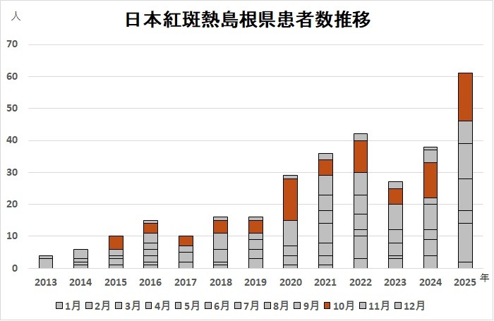 2025年は日本紅斑熱の患者数が過去最大となりました。特に10月の