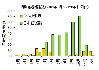 ■つつが虫病 春(3~5月)及びツツガムシのふ化時期である秋(10~11月)から初冬(12月)にかけて多く発生が認められます。